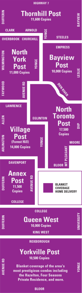Post City’s seven magazines are delivered free of charge to houses within each publication’s coverage area with a total distribution of 95,000 copies per month. They go straight to the mailboxes of Toronto’s most sought-after markets – eight of the top-10 highest median income areas* in Canada, to be exact. Our readers have above-average income, above-average tastes and above-average purchasing power.